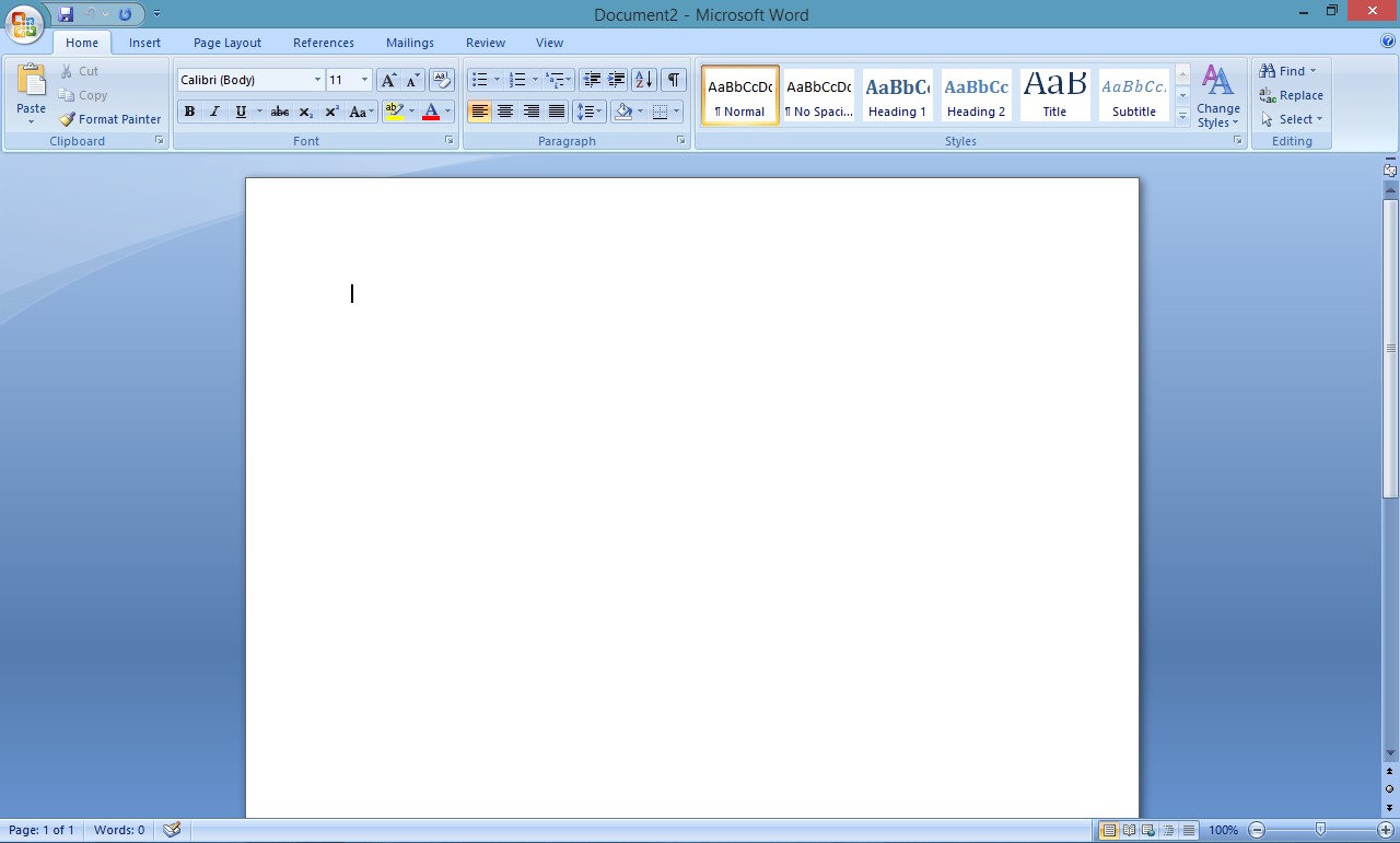Ugifungura porogaramu yawe ya Microsoft word uzabona hafungutse window imeze gutya. Nkuko mubibona ukirangiza gufungura iyi porogaramu hagaragaramo bimwe mu bice by’ingenzi bifasha umuntu mu gukoresha iyi porogaramu. Ibyo bice rero harimo Menu, Buto ya Microsoft Office, Ribbon, Quick Access toolbar, Title bar, Ruler, aho bandika, Umurongo umanutse n’utambitse na Status bar