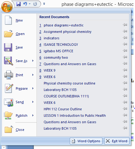 Microsoft Office Button ni buto ihuriyemo utundi dukoresho twa Microsoft Word harimo nka Save cg Save as (idufasha kubika ibyo twakoraga), print (idufasha gusohora ibyo twanditse ku mpapuro), send (idufasha kohereza(kuri email cg mu buryo bwa fax) ), publish (idufasha kubigaragaza ahantu hatandukanye ku mbuga ) na close ikoreshwa umuntu afunga iyo arangije gukoresha Microsoft Word.