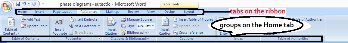 Ribbon ni igice cyo hejuru kigaragaramo ibifungurwa (tabs) zigera muri zirindwi arizo: Home, Insert, Paje Layout, References, Mailings, Review na View, izi tabs zose uko ari zirindwi zihuriyemo byinshi bigize Ms Word. Buri tab iba igabanyijwemo utwunge (groups). Buri group igira indi mirimo ubona aruko ukanze ku kamenyetso kari ahagana hepfo kamanuka. Buri tab iba ifite utu dukoresho dukurikira: Home: clipboard, Fonts, Paragraph, styles na Editing. Insert: Pajes, Tables, Illustrations, Links, Header na Footer, Text na Symbols. Paje Layout: Themes, Paje setup, Paje Back groud, Paragraph, Arrange. References: Table of contents, Footnote, Citation & Bibliography, Captions, Index na Table of Authorities Mailings: Create, Start Mail Merge, Write & Insert fields, Preview Results, Finish. Review: Proofing, Comments, Tracking, Changes, Compare, Protect. View: Dokima Views, Show/Hide, Zoom, Window, Macros.